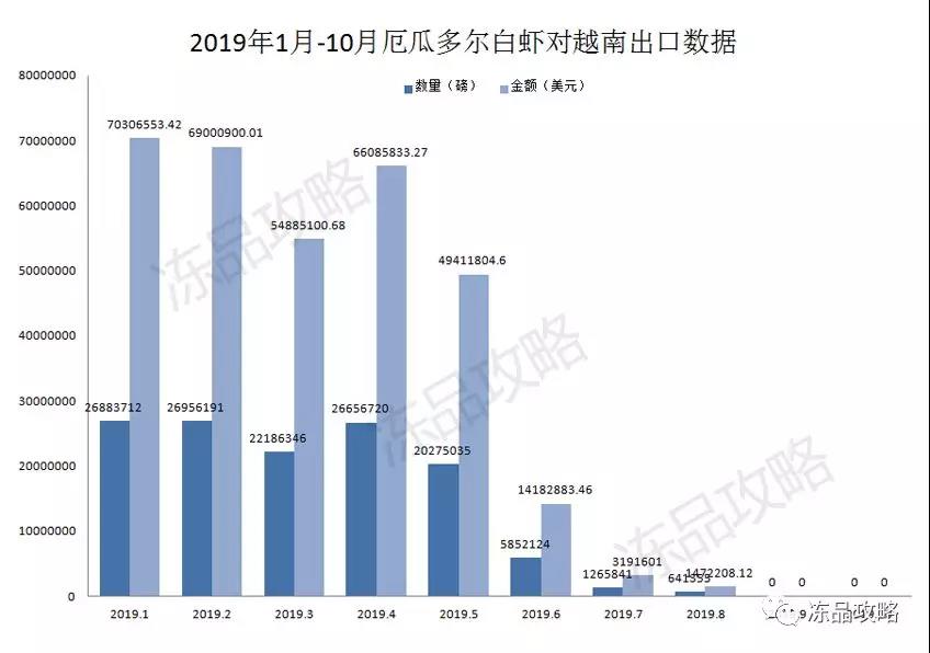同时,从厄瓜多尔水产养殖协会公布的数据来看,9月份厄瓜多尔向越南出口的白虾量依然为零。在今年1月份厄瓜多尔对越南出口量为12194吨(26883712磅),到8月份已下降至290吨(641355磅)。再到9-10月份已经基本实现零进口,这主要受中国海关对灰色贸易渠道严查影响。