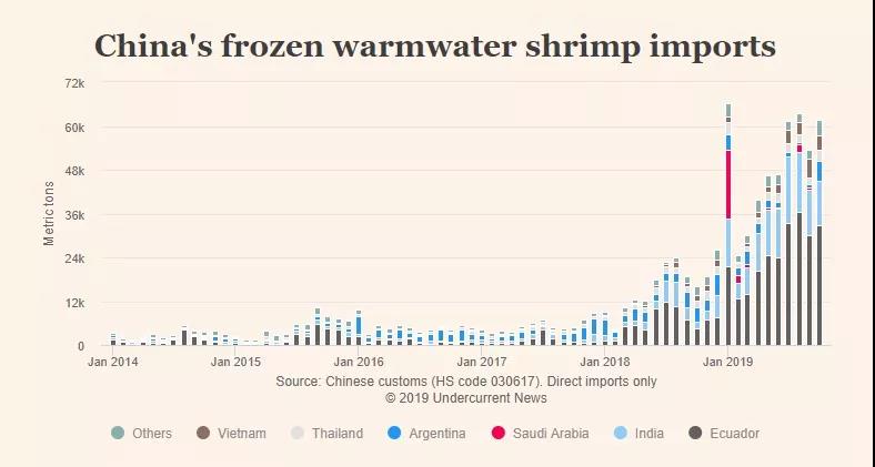 据中国海关公布的最新数据,今年一至十月份,全国虾类的正关进口数量达53.4万吨,包括49.4万吨暖水虾(含阿根廷红虾)和4万吨冷水虾。加上今年早期厄瓜多尔和印度向越南出口的数量(公认为边贸渠道),中国的进口量已突破了60万吨。