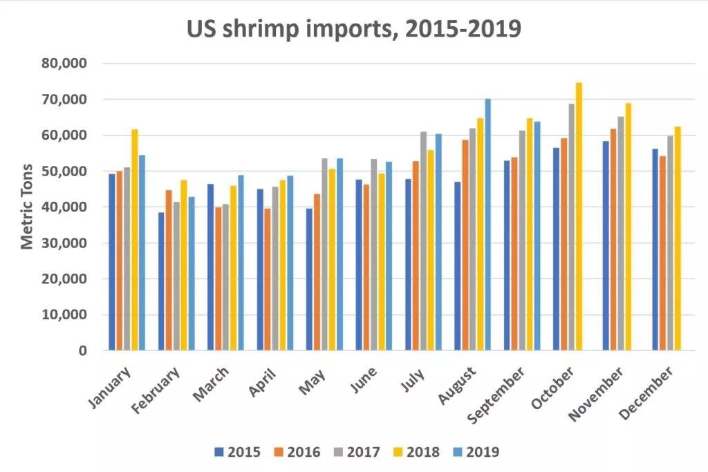 2018年,美国全年进口69万吨虾产品。而今年一至九月份的进口总量为49.5万吨,仅比去年同期(48.9万吨)略有增长。
