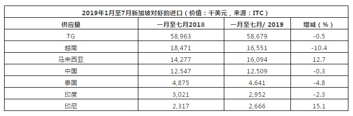 在今年的前七个月中,在排名前四的主要供应商中,只有从马来西亚进口到新加坡的虾增加了12.7%,从越南,中国和泰国的进口量均有所下降。在新加坡市场上,越南虾必须在价格上与中国和泰国等亚洲有竞争力的产品竞争。