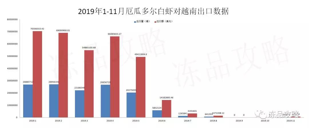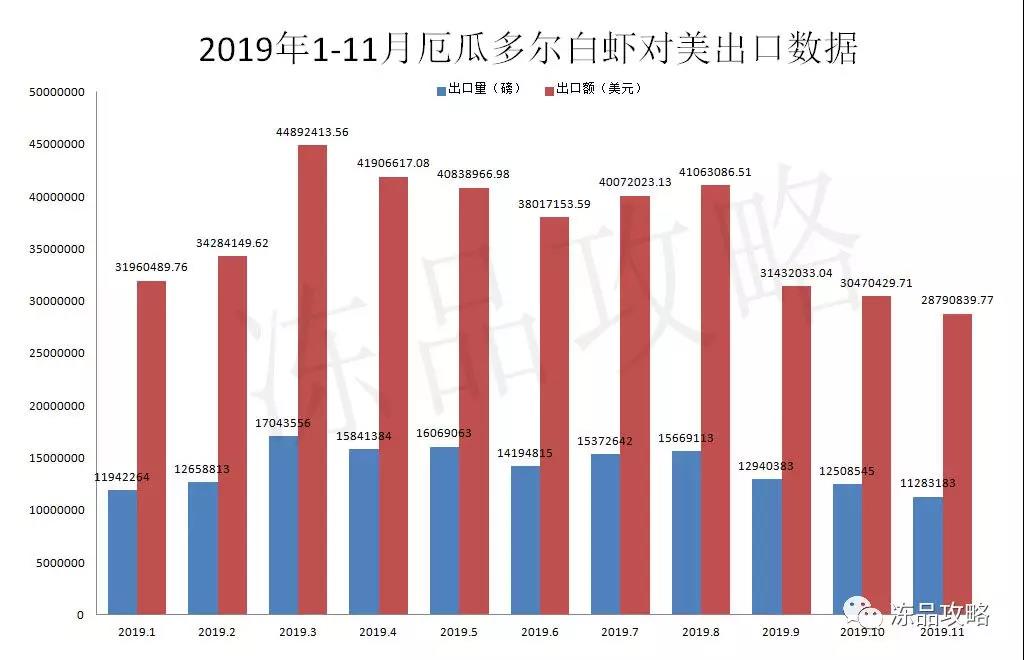 11月份,厄瓜多尔向中国主港出口白虾45796.27吨,同比2018年11月增长305%;同时恢复向越南海防港白虾出口。