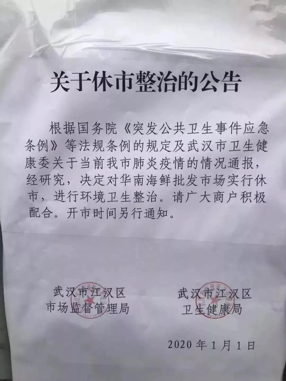武汉发现不明原因肺炎,华南海鲜批发市场休市整治