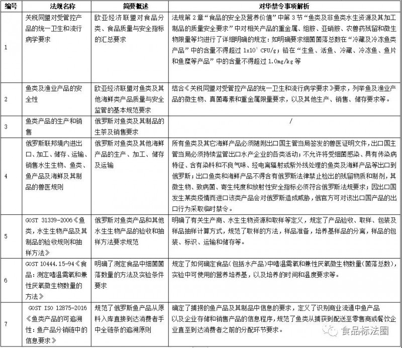 三、俄罗斯水产品监管标法汇总和涉及对华禁令事项解析