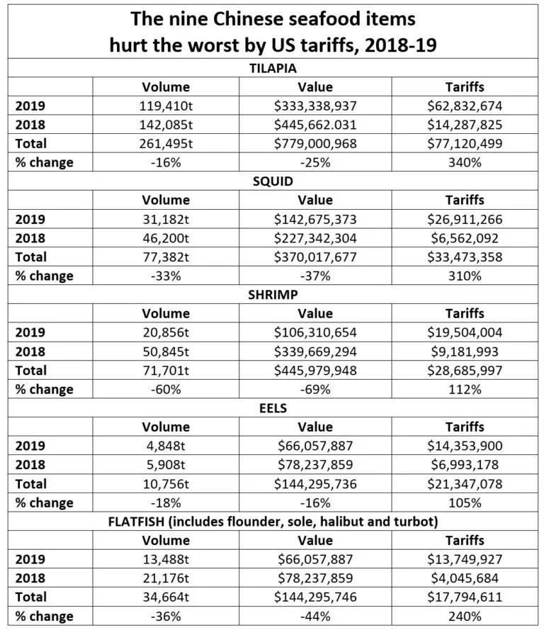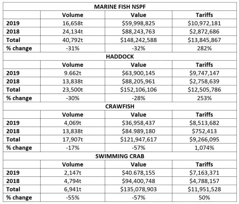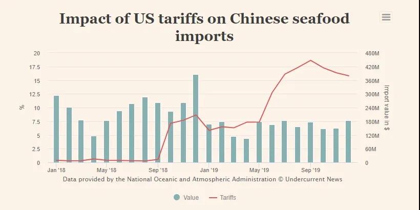 美国海洋与大气管理局(NOAA)统计,2018年十月至2019年十二月间,美国进口商为贸易战支付了3.09亿美元的额外关税,美国从中国进口海产品总量从2018年的59.4万吨减少至2019年的43万吨,进口额削减三分之一以上。