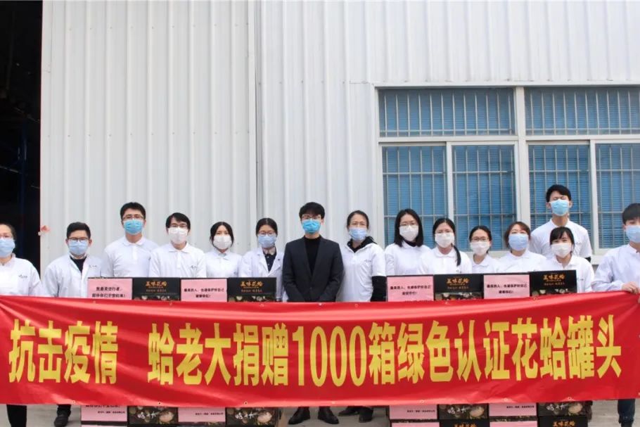 3月7日,蛤老大(福建)食品有限公司向武汉各支医疗队的抗疫一线捐赠了1000箱绿色认证花蛤罐头,货值约35万元。这些健康海鲜食品全部送往武汉抗疫一线人员手中,为他们提供佐餐营养。