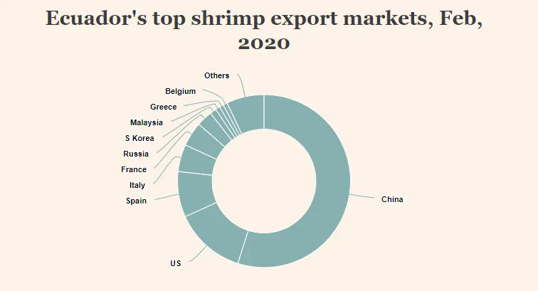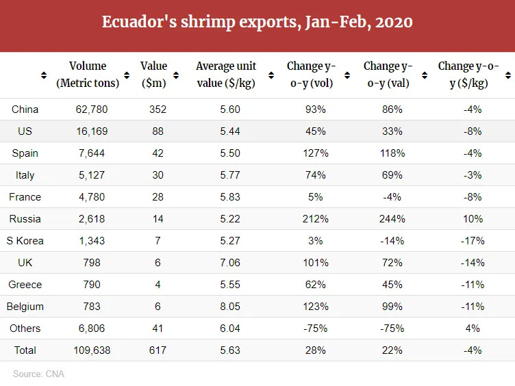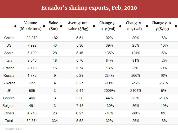 据厄瓜多尔水产养殖协会(CNA)最新数据,2020年二月份厄瓜多向中国出口33,221吨白虾,较2019年同期(包括中国和越南)增长13%,出口额1.84亿美元。