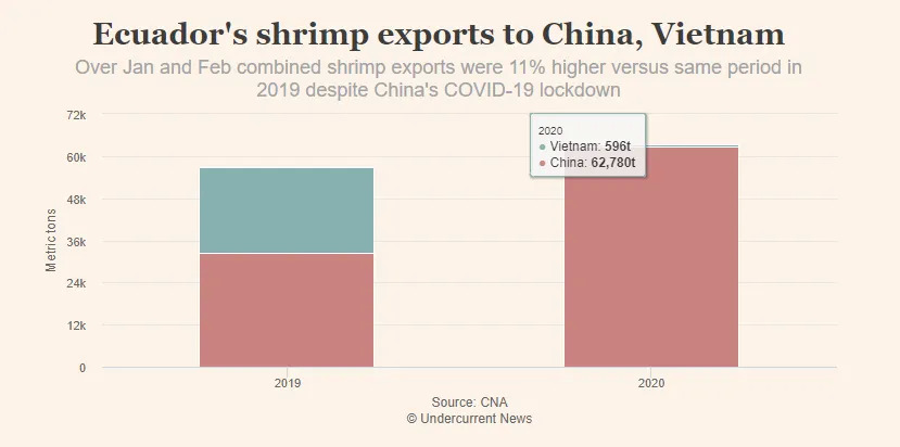 当时,中国境内新冠疫情正值爆发期,厄瓜多尔白虾出口反而迎来正增长,向全球市场释放出一种积极信号:中国需求仍然强劲!
