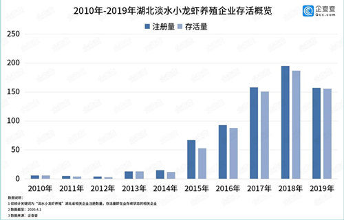 在疫情爆发之前,湖北小龙虾产业发展欣欣向荣,随着“虾稻综合种养技术”的普及和应用,小龙虾养殖发展迅猛。据企查查数据显示,2016年-2018年湖北迎来淡水小龙虾养殖企业注册高峰,并且企业存活率十分可观,2018年相关注册量最高,数量近200家。