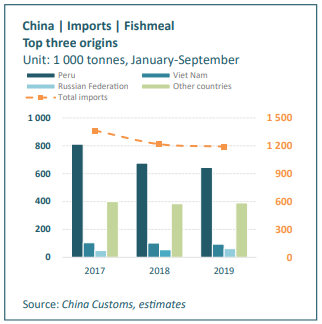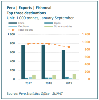 2019年秘鲁的第一个鳀鱼捕捞季节于7月结束,在2019年11月之前,中北部地区禁止鳀鱼捕捞。在2019年的前9个月,秘鲁鳀鱼捕捞量为243万吨,与2018年同期相比减少了41.5%。原料鱼产量的下降导致鱼粉产量的下降,2019年前9个月,秘鲁鱼粉产量仅为564,122吨,与2018年同期相比下降60%。同期,秘鲁其他捕捞渔业产量尽管下降幅度没有鳀鱼大,但也与鳀鱼情况相类似。
