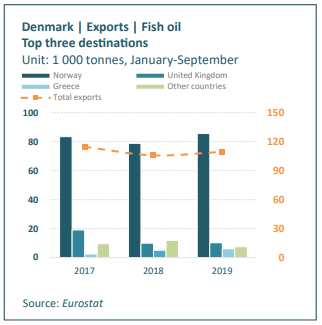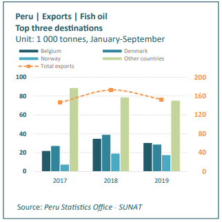 2019年上半年秘鲁鱼粉出口形势良好,与2018年同期相比增长了12%(达62.7万吨)。然而,这种良好的势头并没有在2019年第三季度持续,导致2019年前9个月的最终数据(85.9万吨)比2018年同期下降了9.75%。出口下降在很大程度上可以归因于中国的非洲猪瘟(ASF)大面积爆发,减缓了中国在2019年第三季度的鱼粉进口步伐。2019年前9个月秘鲁的鱼油出口下降了12%。在其他地方,丹麦的鱼油出口保持稳定,其76%的鱼油销往了挪威市场。