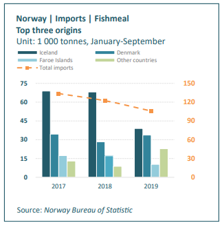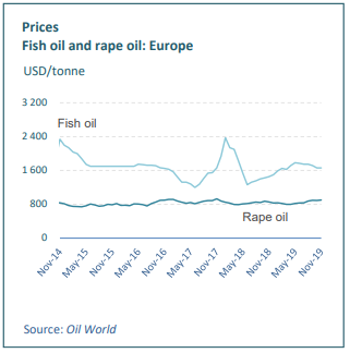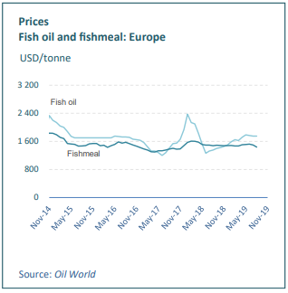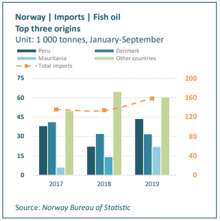 挪威的鱼粉进口量下降了13%,而鱼油进口量增加了近20%。截至2019年9月底,三文鱼的存量同比增长6.7%,投喂三文鱼的饲料需要大量的鱼油。