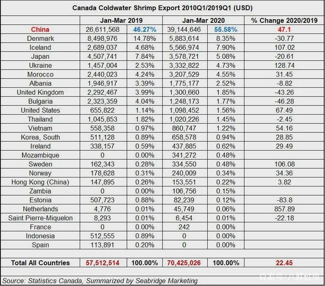 2020年1季度加拿大北极虾向中国出口逆势增长47%!
