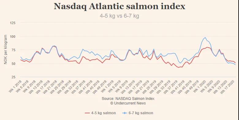 纳斯达克指数显示,过去三个月三文鱼市场出现罕见一幕,6-7kg规格挪威大西洋鲑价格下跌十分明显,甚至比小规格还要便宜。据上周的价格,6-7kg挪威三文鱼均价NOK 47.17/kg,4-5kg均价在NOK 50.71/kg。