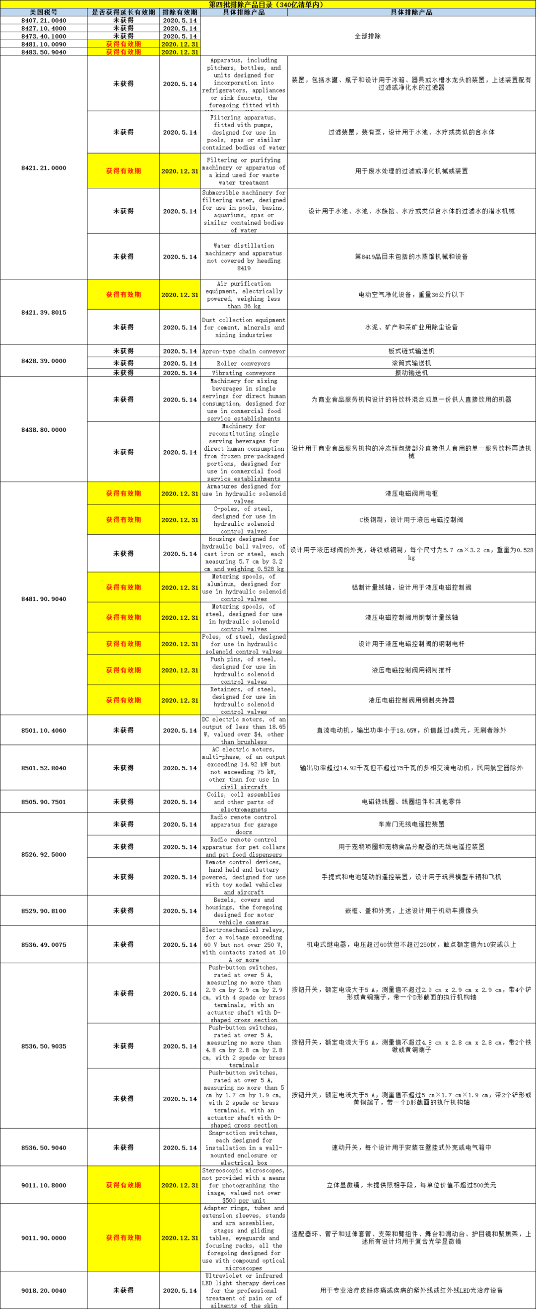 340亿第四批排除清单有效期延长情况表