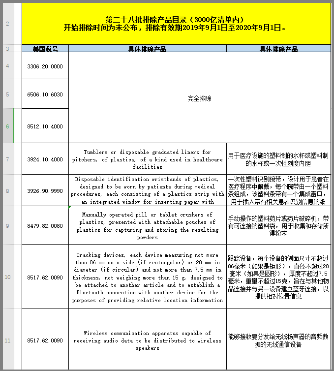 注意:本公告中宣布的产品排除加征有效期为:2019年9月1日至2020年9月1日。