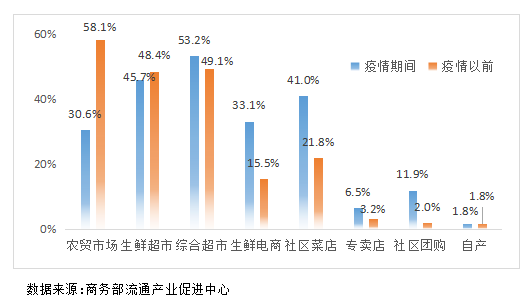 疫情期间,终端零售渠道结构发生了明显变化,超市消费受影响不大,生鲜电商、社区菜店和社区团购消费激增,农贸市场消费下降明显。线上企业布局线下渠道,线上线下渠道加快融合。
