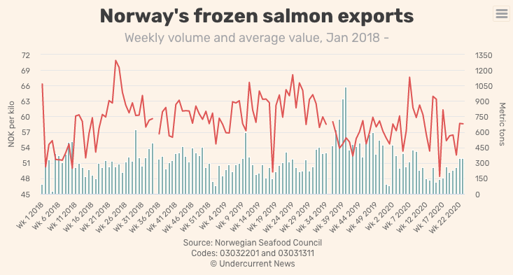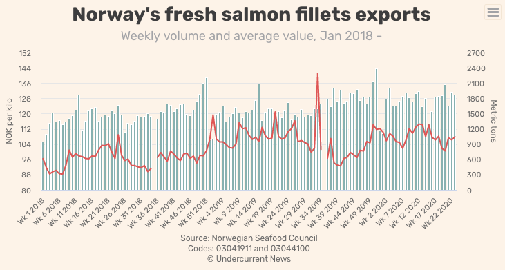 挪威海产局(NSC)统计,2020年第23周,挪威出口13,495吨冰鲜三文鱼(整条鱼),出口量较上一周(16,358吨)下降18%,较上年同期增长6%,一周内出口单价从NOK 64.32/kg上涨至NOK 69.15/公斤,较去年同期上涨12%。