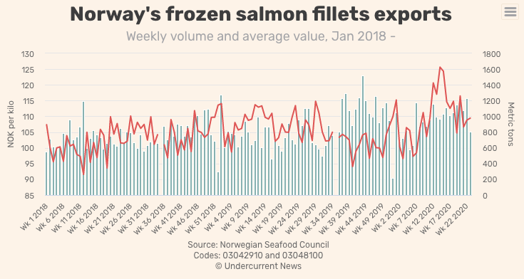 自今年年初以来,挪威冷冻三文鱼鱼片的出口维持在低位,第22周出口量为806吨,较上一周下降34%,价格从第21周的NOK 108.81/kg上涨至NOK 109.43/kg。