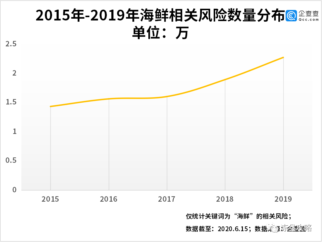 数据显示,2015年以来的五年内,海鲜行业的风险数量逐年递增,2019年的风险数量和风险新增量达到五年之最,共2.27万条,同比增长率为20.1%。