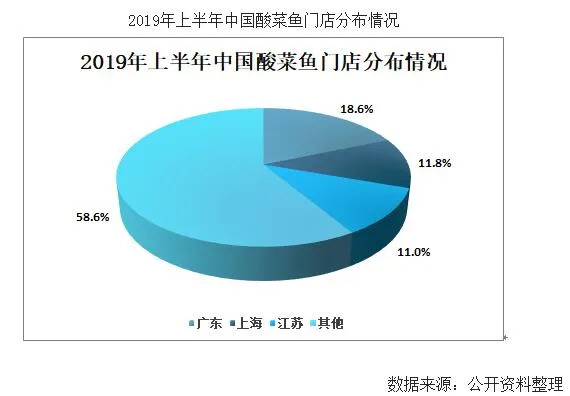 近两年我国酸菜鱼门店数量保持高速增长趋势,从酸菜鱼门店分布情况来看,我国酸菜鱼市场主要分布在北上广等经济较为发达的地区,2019年上半年广东酸菜鱼门店数量占比居全国第一,达18.6%,其次为上海和江苏,分别占比11.8%和11%。