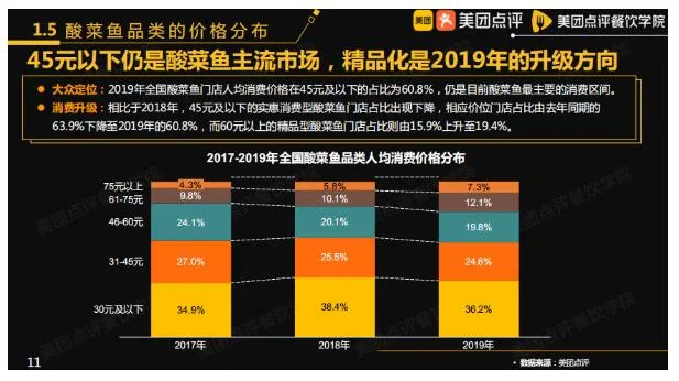 据有效数据显示,目前酸菜鱼的人均消费价格区间仍集中在45元及以下,占比60.8%。不过相较2018年,45元以下的实惠消费型酸菜鱼门店占比出现下降,而60元以下的精品型酸菜鱼门店占比则由15.9%升至19.4%。