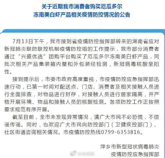 这则误读新闻的源头,来自14日发布的一则《关于近期我市消费者购买厄瓜多尔冻南美白虾产品相关疫情防控情况的公告》,发布部门是萍乡市新型冠状病毒肺炎疫情防控应急指挥部。
