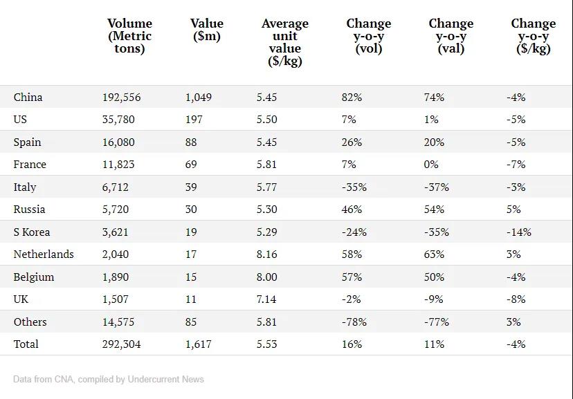 今年前五个月,厄瓜多尔共出口29.2万吨虾产品,较去年同期增长16%,出口额16.2亿美元,较去年同期增长11%。前五个月,厄瓜多尔已向中国出口19.3万吨虾产品,占其全国出口总量的66%,出口额10.5亿美元,占全出口额65%。