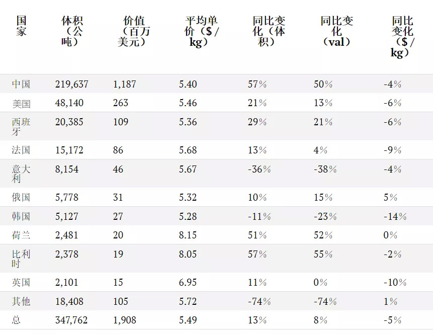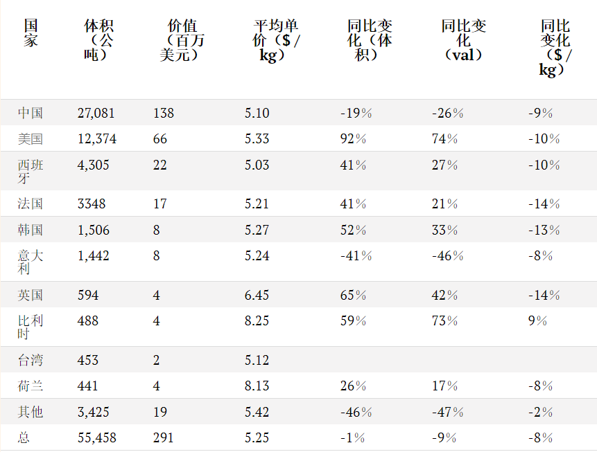 6月出口平均单位价值仅为每公斤5.25美元,低于5月份的5.43美元/公斤。这是过去十年来平均出口额最低的一年。对西班牙的出口尤其便宜,为5.03美元/千克,与2019年6月相比下降了10%(见上文表1)。