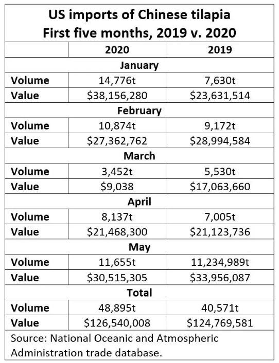 2019年与2020年1-5月份美国罗非鱼状况(来源:NOAA)