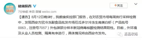 8月12日晚9时,陕西卫健委接疾控部门报告,在对农贸市场每周例行采样检测中,发现西安方欣冷冻副食品批发市场厄瓜多尔冷冻生南美白虾(产品批号0063,注册号7057)外包装部分样本新冠病毒核酸检测结果阳性。