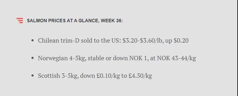 8月27日,智利卡车司机工会进行无限期罢工,以对智利南部土著马普切人与政府之间的暴力冲突表示抗议,受事件影响,第36周智利三文鱼在美国市场的价格开始反弹,挪威与苏格兰三文鱼价格仍维持稳定,甚至略有下跌(下图)。
