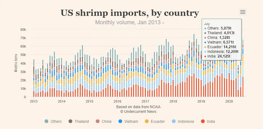 美国虾类进口快速反弹,与餐饮市场恢复直接相关。值得注意的是,印度出口环比增长104%,达到2.4万吨,进口额约2.06亿美元,并重新夺回第一供给国席位。五、六月份印度曾被印尼赶超,退居第二出口国。