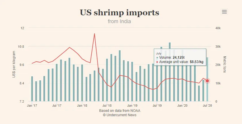 六月份开始,厄瓜多尔出口商就通过“以价换量”的方式向美国推销产品,以弥补衰退的中国市场。在价格方面,厄瓜多尔虾价连续数月保持上涨,为满足美国需求,厄加工企业提升附加值去头虾产能。七月份均价涨至$6.27/kg,但相比去年同期,跌幅仍达到11%。