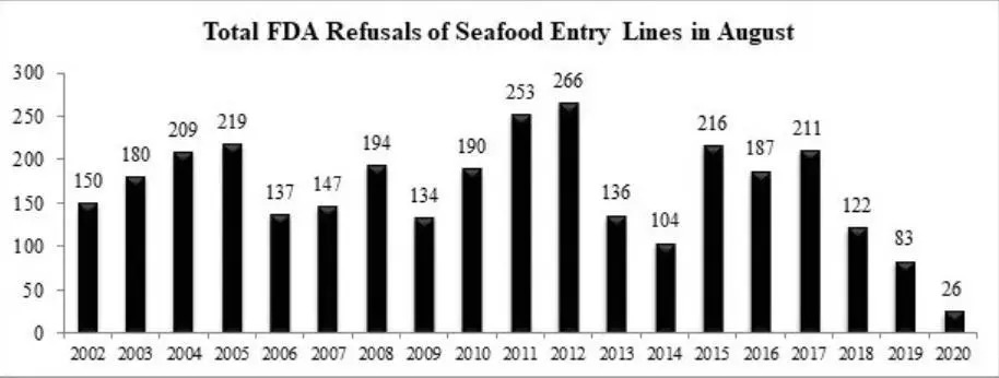 在过去的四个月中,FDA拒绝海鲜进口行的数量低的惊人。在2002年至2019年之间,FDA在5月至8月的四个月中,平均有660例拒绝进入生产线。今年,FDA在过去四个月中仅拒绝了129条海产品入境路线;与前18年的历史平均水平相比,下降了80%。