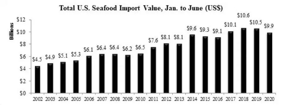 FDA拒绝海鲜进口行的大幅下降与海鲜进口量高得令人难以置信。尽管根据美国《协调关税表》第3章以及四位数代码1603、1604和1605进口的海产品的总价值在过去两年中每年都有所下降,但它们一直保持在大约100亿美元。今年海产品总进口额为99亿美元,比前18年的历史平均水平(每年前六个月)为75亿美元,增长了33%。