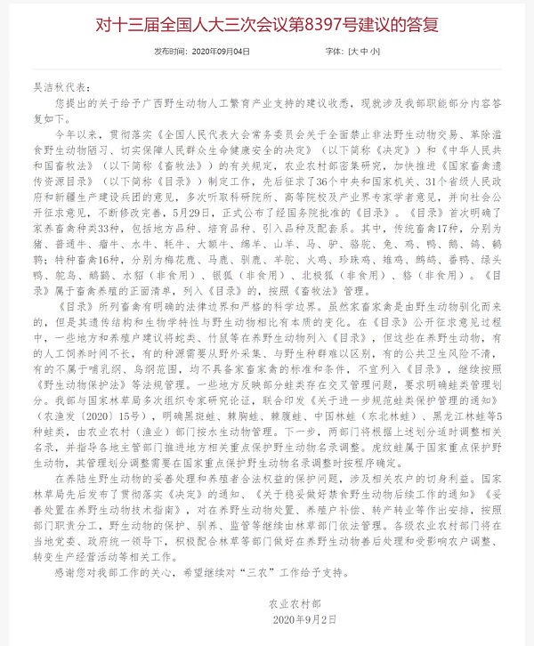 您提出的关于给予广西野生动物人工繁育产业支持的建议收悉,现就涉及我部职能部分内容答复如下。