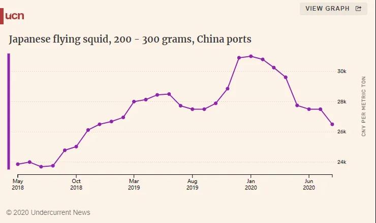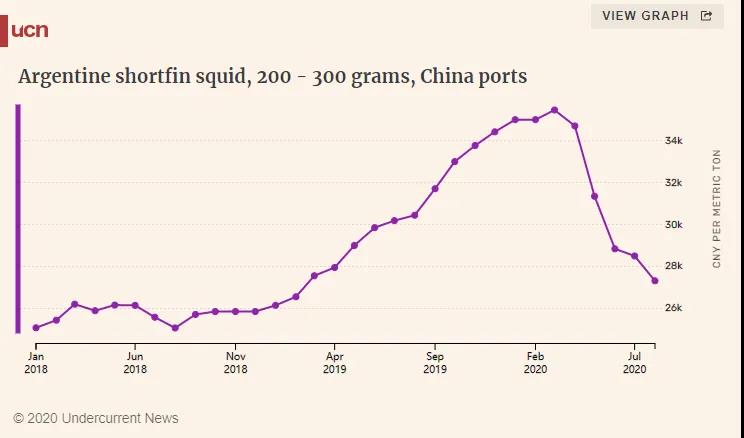 今年年初,鱿鱼价格曾创下历史高位记录,但随着疫情发展,阿根廷鱿鱼和太平洋褶柔鱼价格均出现下跌。8月份,200-300g冷冻阿鱿价格跌至CNY 27,315/t,北鱿价格跌至CNY 26,500/t。