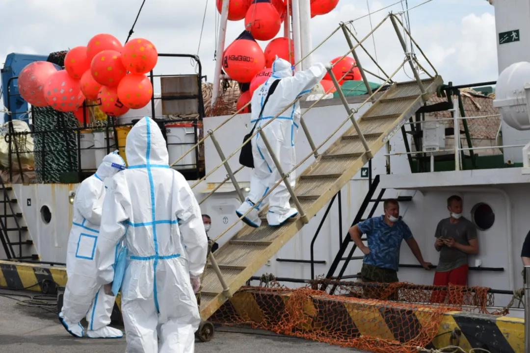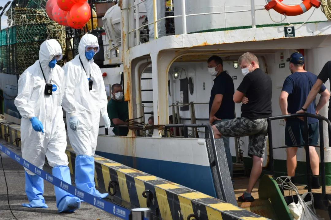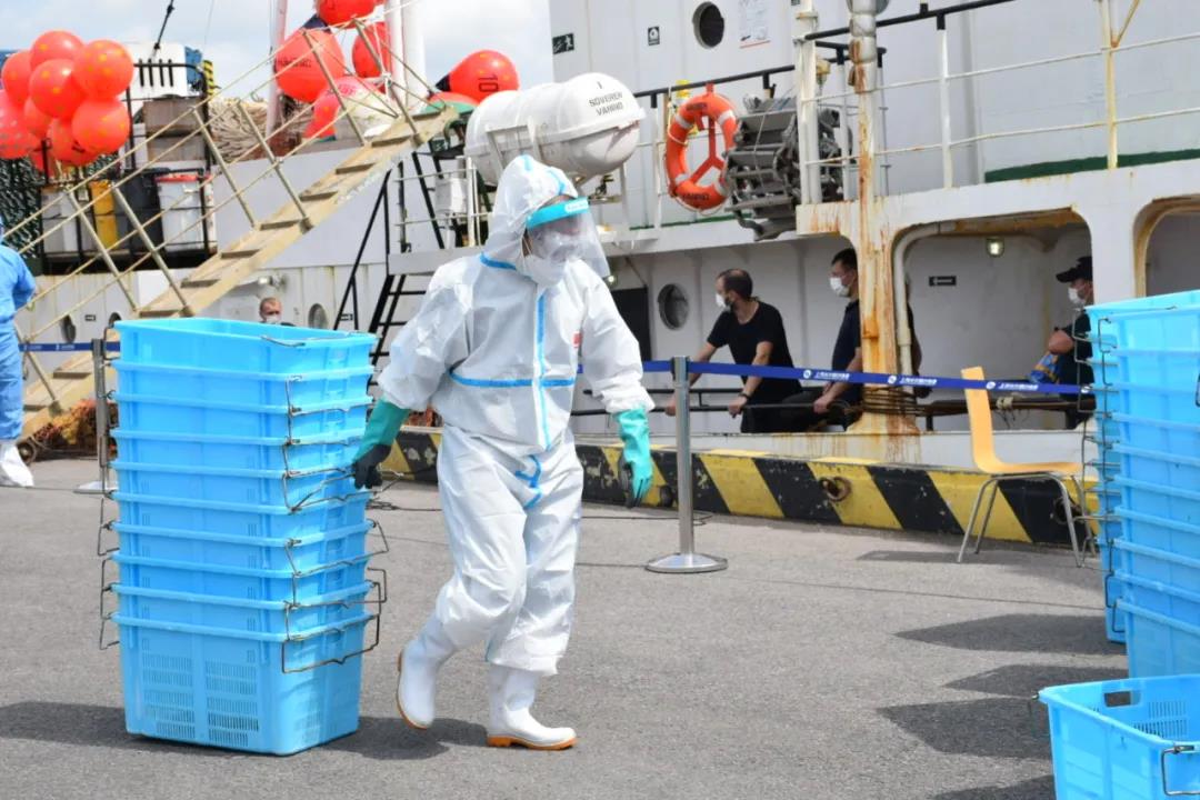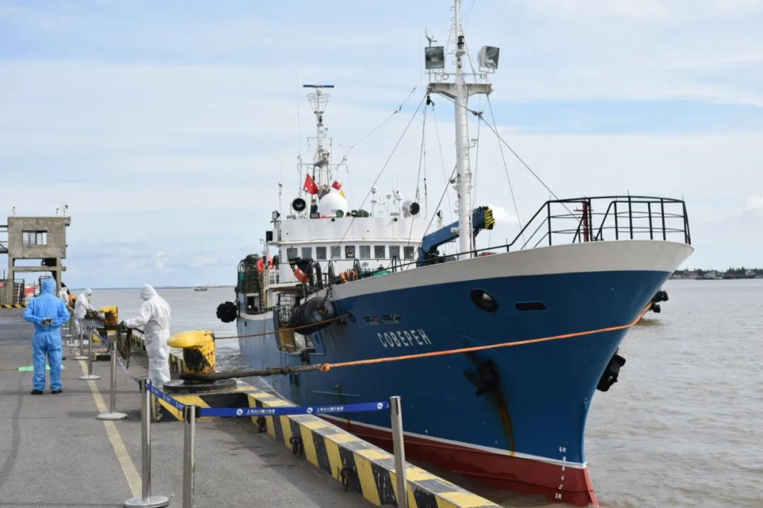 2020年9月14日,满满一船鲜活帝王蟹从俄罗斯远道而来,抵达上海长兴岛横沙国际渔港码头。这是今年疫情爆发以来第一艘抵达横沙国际渔港的俄罗斯帝王蟹运输船。