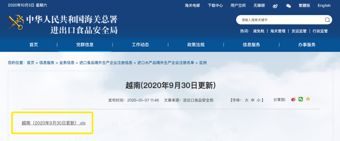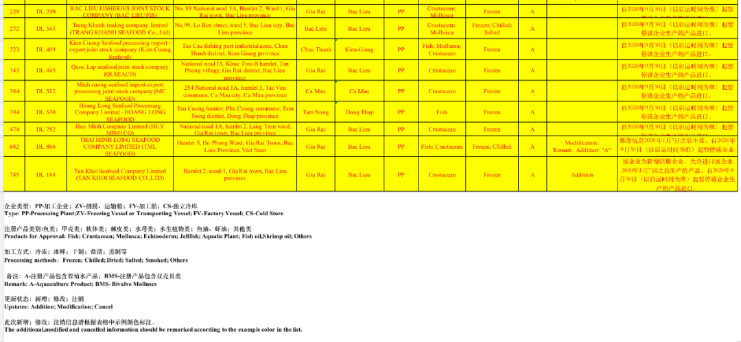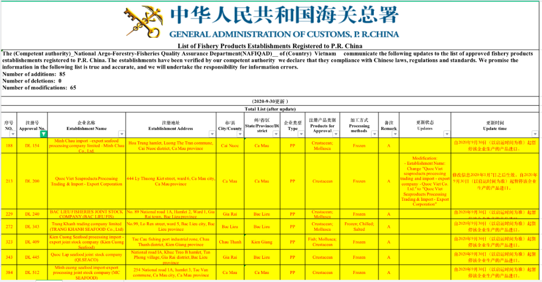 9月30日,海关总署更新了越南水产企业输华名单,名单显示,有11家越南水产企业生产的产品自9月30日起被暂停进口。