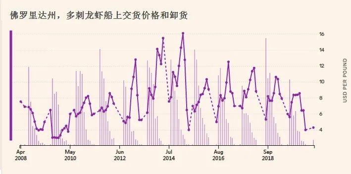 加州码头周围的消息人士现在担心,当一周后新的季节开始时,多刺龙虾的价格将降至每磅6美元至8美元之间。 “我们不知道价格会是多少,直到我们的新季龙虾捕捞开始,”Kat Jones说,她和丈夫Evan Jones在加州文图拉港共同拥有一艘龙虾渔船“Billie June”和零售业务Ventura Fresh Fish。 “然后,如果价格不好,我们要怎么处理那些龙虾?” 另一个不祥的迹象是,8月和9月,佛罗里达州新季伊始,首批489450磅长棘龙虾已经登录在码头上,而这批龙虾的价值却只有220万美元。最终约为4.56美元/磅,较2019年全年平均的7.82美元/磅下跌了42%。