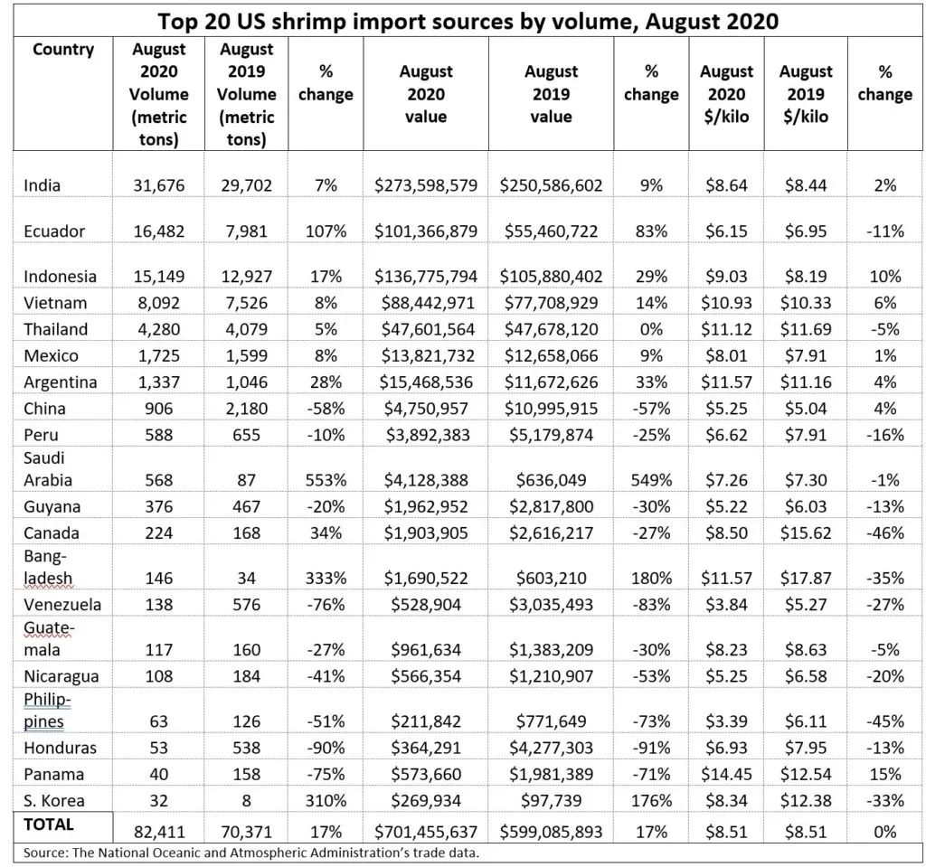 印尼对美出口也在增加。8月份印尼白虾到货量为15,149吨 ,同比增长17%;价值1.37亿美元,同比增长29%。