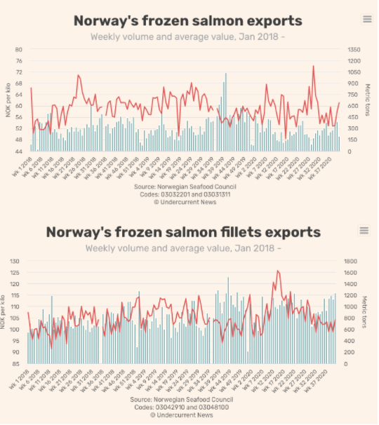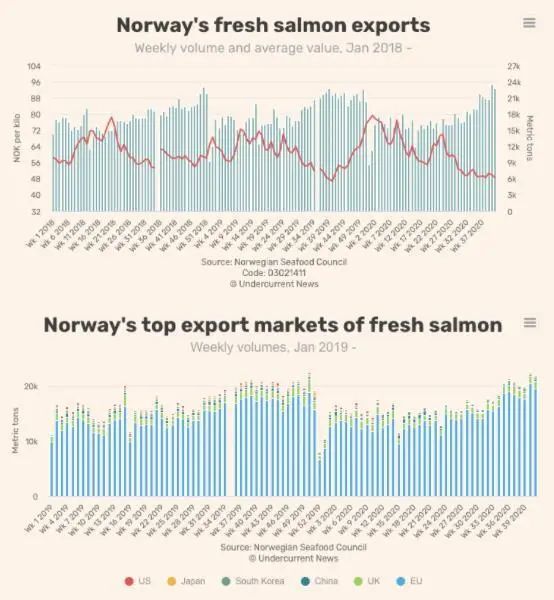 挪威海产品发布的数据显示,尽管第41周,挪威鲜鲑鱼出口量环比下降3%,至22,815吨,但对亚洲的韩国,中国和日本的出口分别增长了58%,33%和3%。