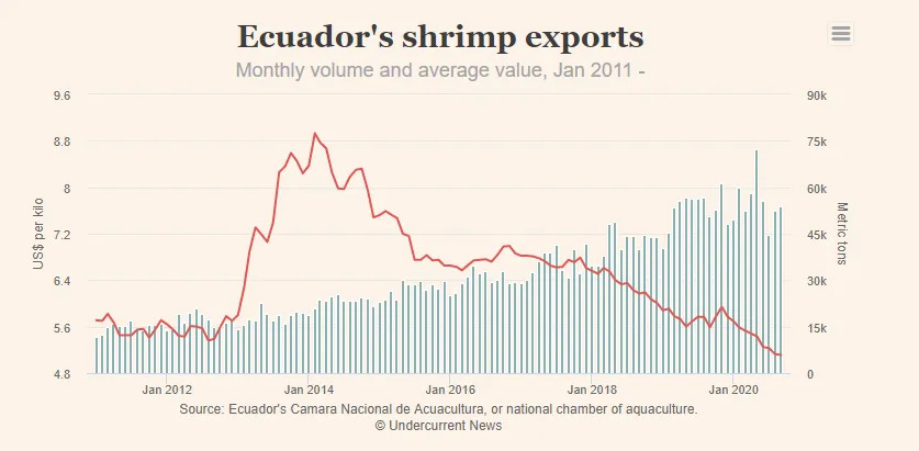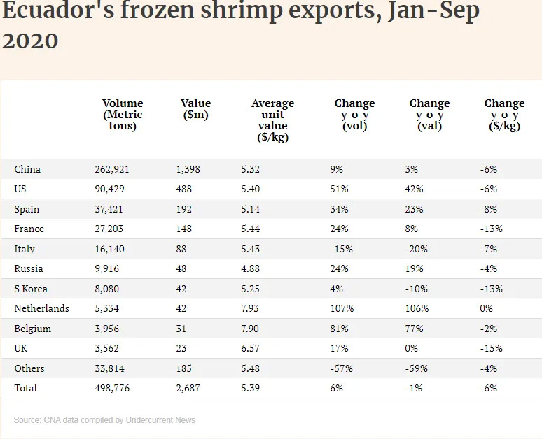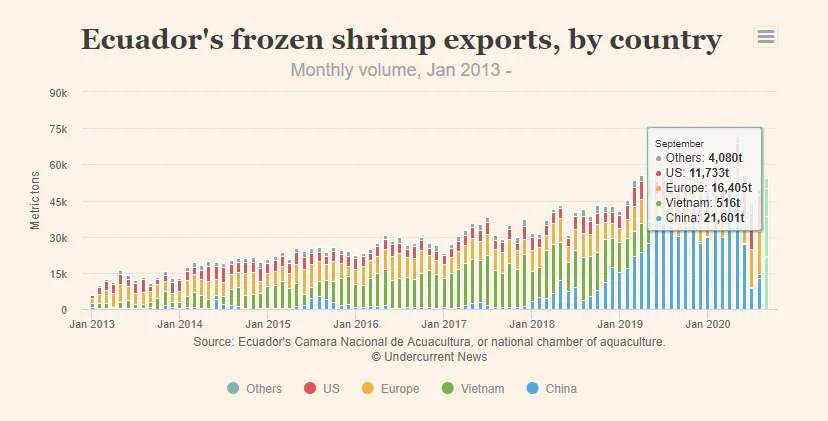 1-9月份,厄瓜多尔向中国出口262,921吨虾产品,较去年同期增长9%;货值13.98亿美元,较去年同期增长3%。