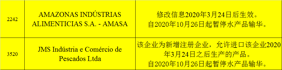 | 2.巴西注册编号2242企业自2020年10月26日起暂停水产品输华。 |