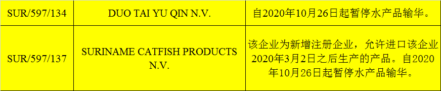 | 2.苏里南注册编号SUR/597/137企业自2020年10月26日起暂停水产品输华。 |