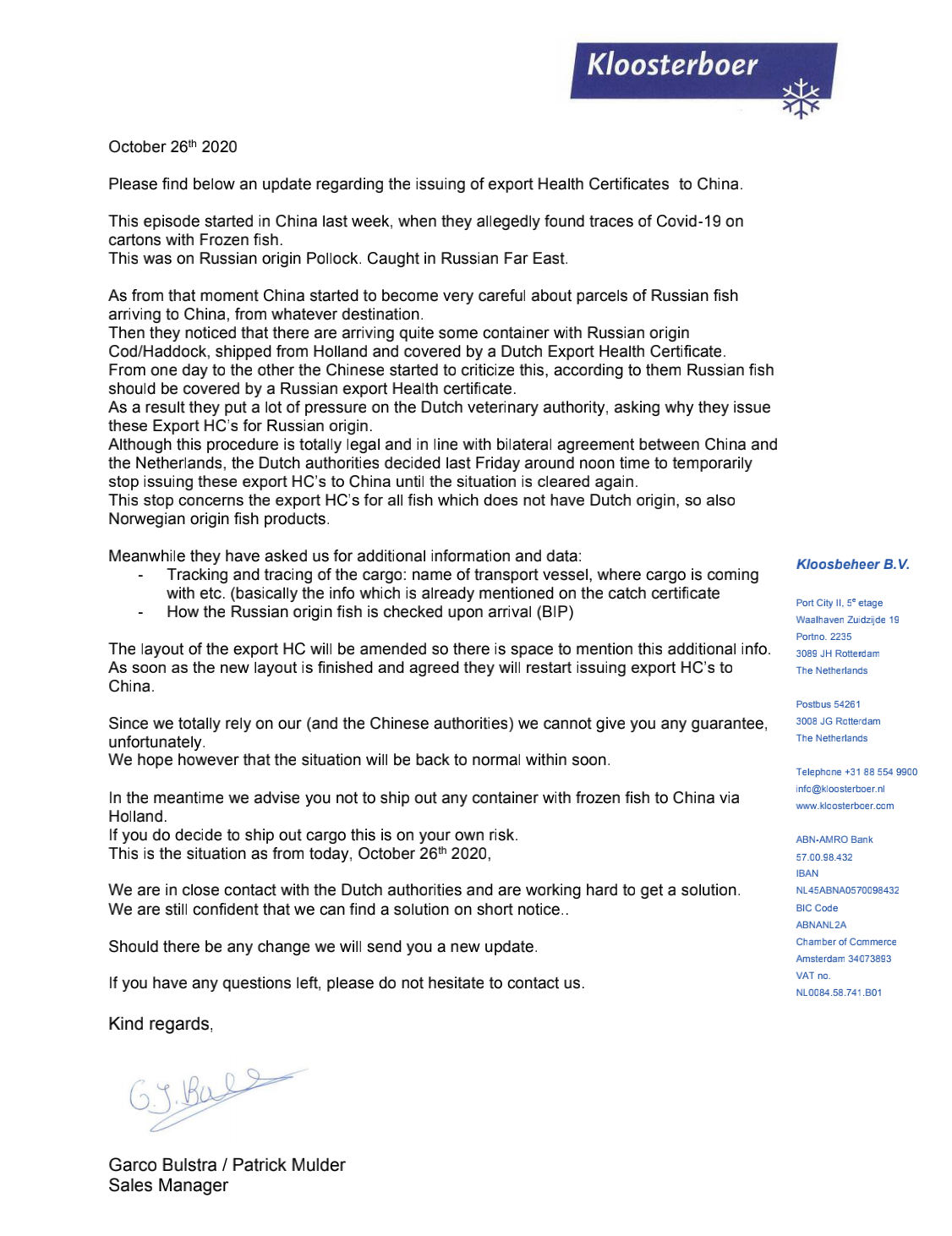 通知提及,中国检出的活新冠病毒源自俄罗斯远东地区所产的狭鳕,中方对荷兰(签发认证)提出批评(尽管两国签有协议),认为俄罗斯产品应由俄罗斯出具健康认证,荷兰兽医局也因此承担了巨大压力,并决定暂停向出口中国的海产品(包括挪威海产品)签发健康认证。