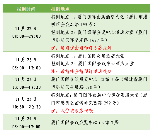 11月23日下午和11月24日全天在厦门国际会议展览中心C3馆3层设置报到台。