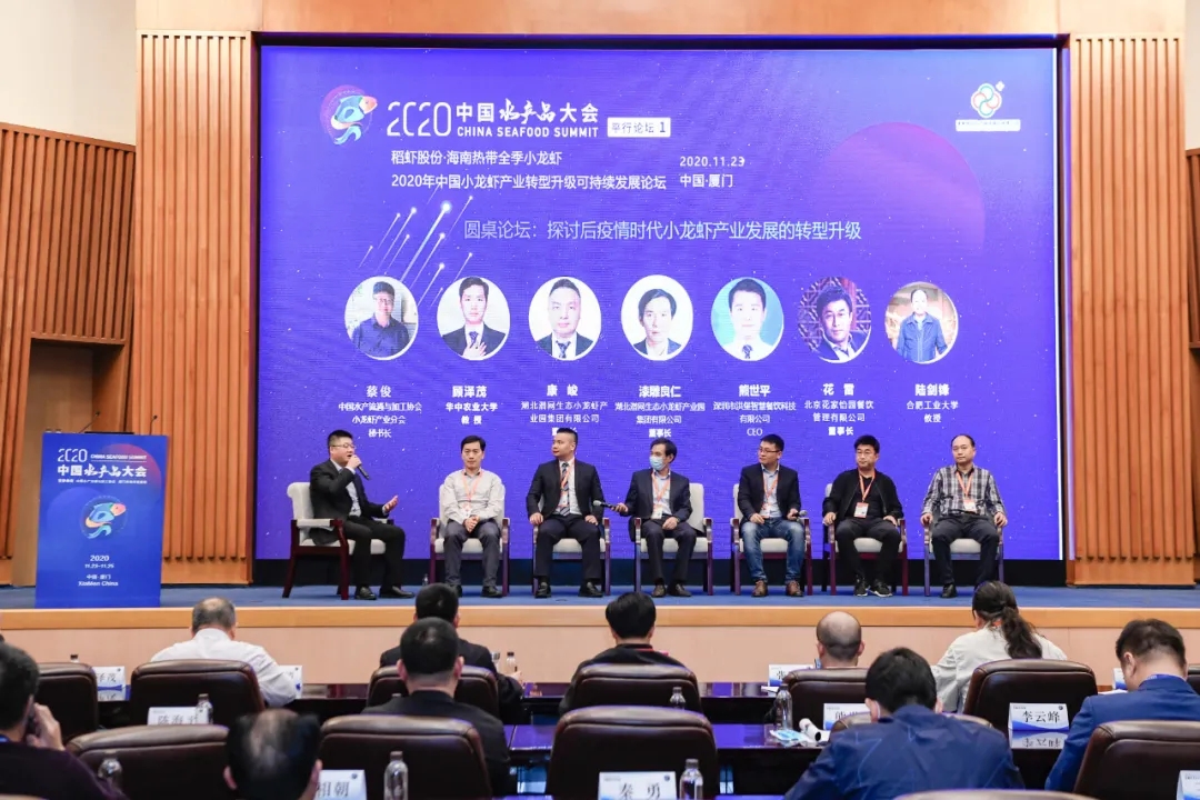 在精彩的主题报告后,圆桌论坛成了本次论坛的焦点。本次论坛由中国水产流通与加工协会小龙虾产业分会秘书长 蔡俊主持。华中农业大学教授 顾泽茂、湖北潜网生态小龙虾产业园集团有限公司董事长 康峻、华山科技股份有限公司董事长 漆雕良仁、深圳市洪堡智慧餐饮科技有限公司CEO 熊世平、北京花家怡园餐饮管理有限公司董事长 花雷、合肥工业大学教授 陆剑锋6位嘉宾汇聚一堂,以“探讨后疫情时代小龙虾产业发展的转型升级”为话题展开分享讨论。
