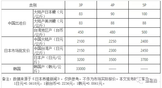 最近,日本市场进口活鳗的需求量明显增长,订单也持续增加。目前,日本国内不少专门店已经开始改用我国大陆产活鳗了。”上周,日本市场进口中国大陆产活鳗110吨左右,进口台弯地区产活鳗20吨左右。价格如下。