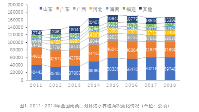 根据《中国渔业统计年鉴》数据,2011-2018年,我国南美白对虾海水养殖面积整体上表现为波动增长趋势(图1)。2011年为13.14万公顷,此后逐年上升,2015年达到峰值17.31万公顷,其后开始出现下降,2018年为16.70万公顷,但仍比2011年高出27.1%。其中,山东从4.04万公顷增长到近5.97万公顷,占比上升到35.80%,广东则从4.49万公顷减少到4.17万公顷,占比下降到24.97%,两省合计超过占全国6成。广西、河北、海南、福建4省占全国养殖面积3成。